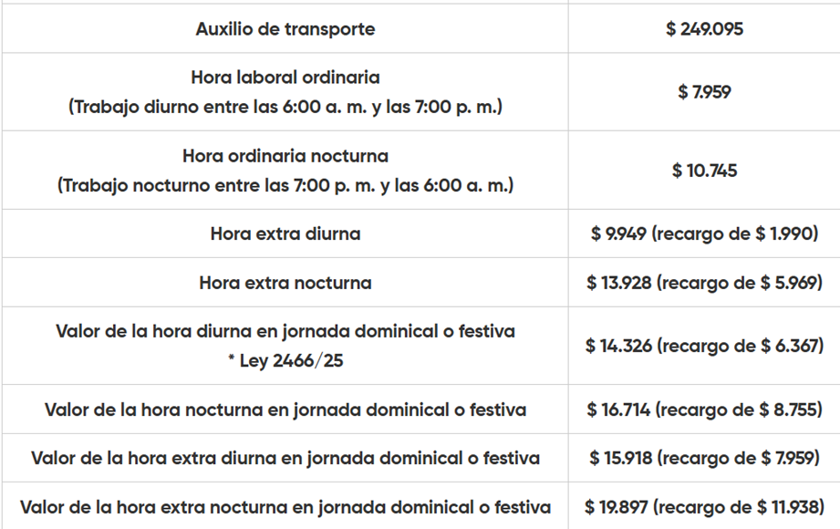 Teniendo en cuenta el valor del salario, que regirá a partir del 1° de enero del 2026, así como la reducción de la jornada laboral a 44 horas semanales, que aplicará hasta el 15 de julio del 2026, en virtud de la Ley 2101 del 2021, las horas laboradas en el mes serán 220 y el valor de la hora laboral ordinaria quedará en $ 7.959