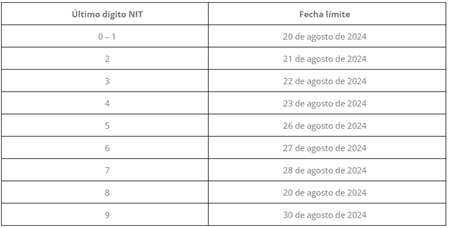 Dado que en el calendario inicial se dispuso el día 19 de agosto de 2024 (lunes festivo) como fecha límite para la presentación de la información por parte de los contribuyentes cuyo último digito del NIT es 0, el INCP envió una carta a la SDH informando esta novedad y la entidad respondió que modificaría la fecha