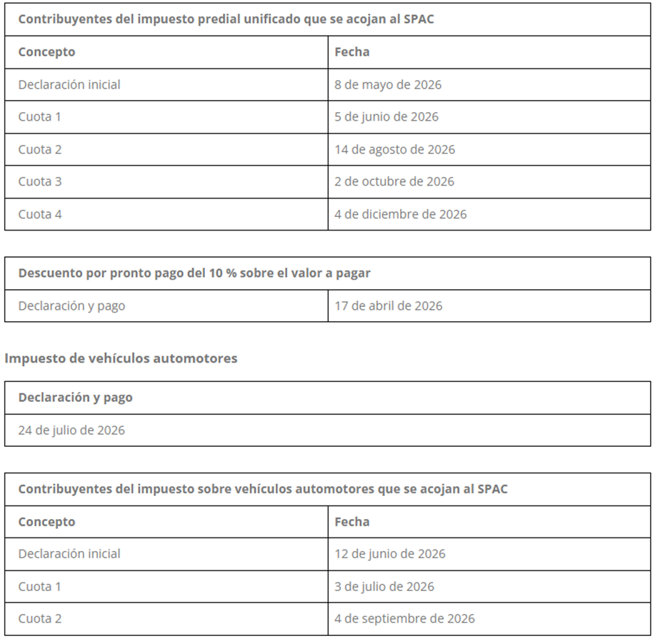 Se definió el calendario de pagos del impuesto de industria y comercio (ICA), el impuesto predial unificado, el impuesto sobre vehículos automotores, entre otros. Además, se establecieron las fechas de pronto pago para que los contribuyentes puedan acceder a descuentos tributarios y las fechas de pago para aquellos que deseen acogerse al Sistema de Pago Alternativo por Cuotas Voluntario (SPAC).